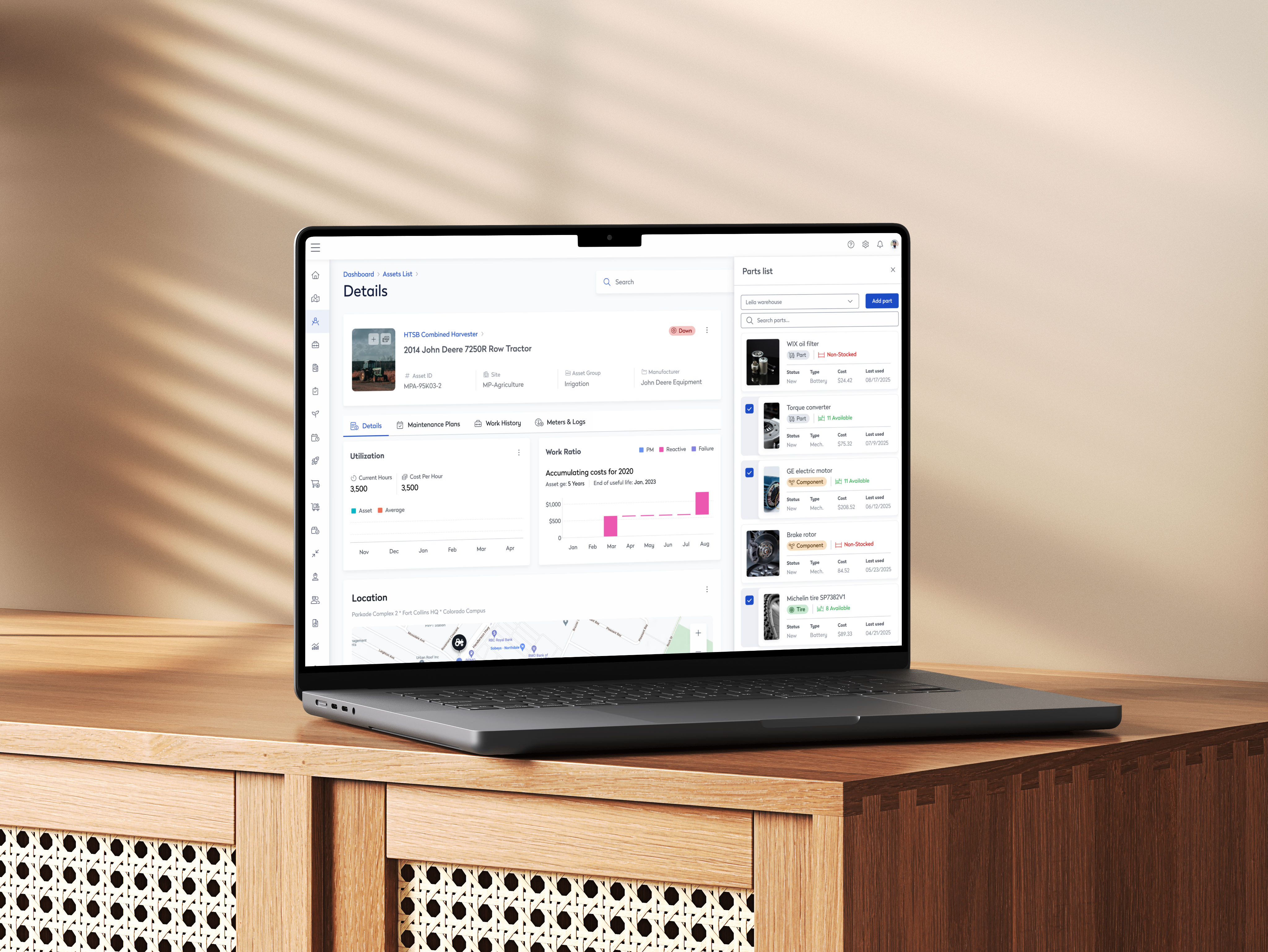 To improve efficiency and reduce context switching, we integrated parts management directly into the asset detail view. Users can now monitor asset performance—such as utilization, cost per hour, and maintenance history—while managing associated parts from the same screen. The right-side panel provides real-time access to parts by location, with clear labels for availability, type, and cost. Technicians can quickly search, filter, and add parts without leaving the workflow. This streamlined approach improves decision-making, speeds up maintenance planning, and supports a more seamless user experience.
