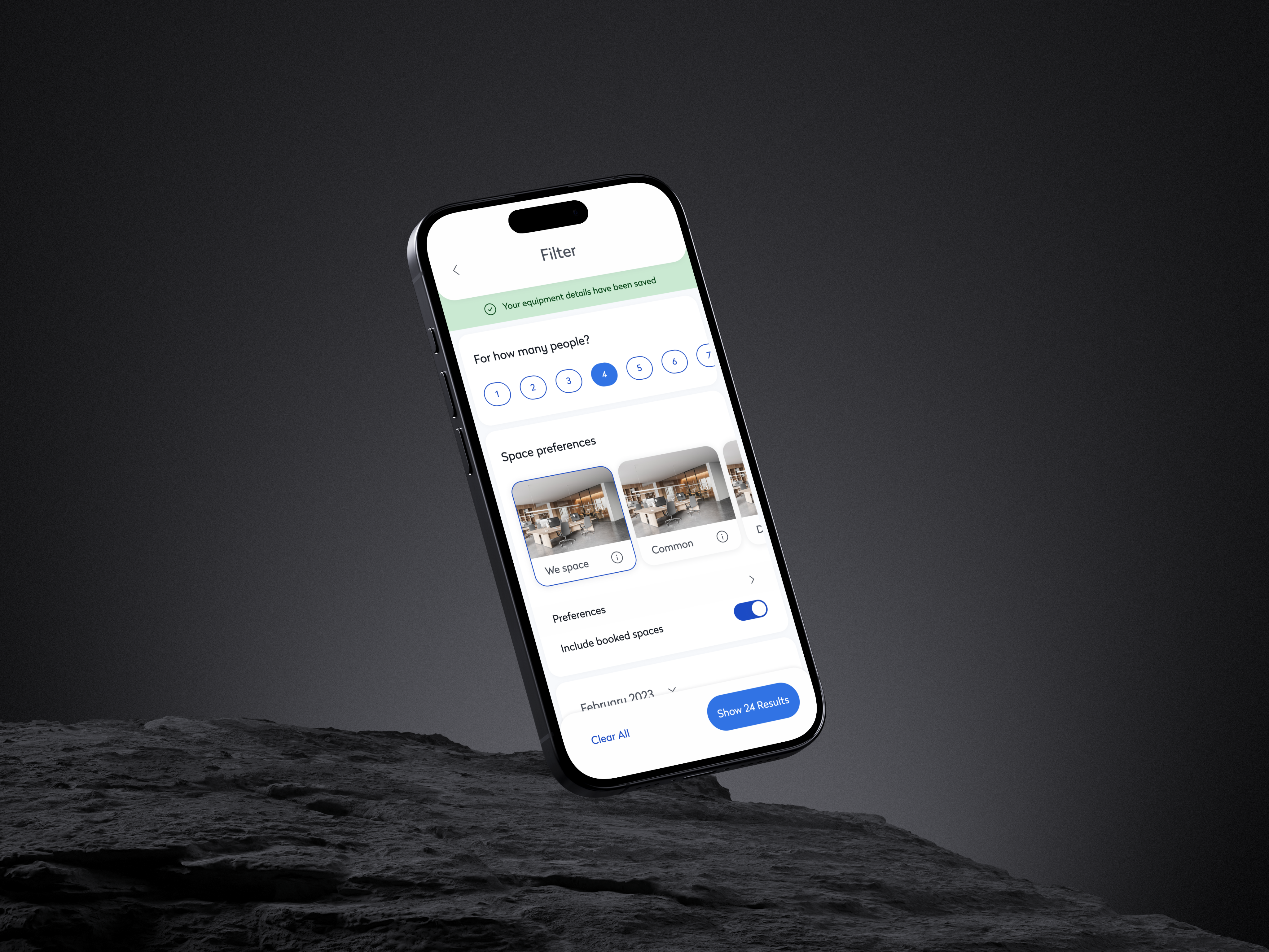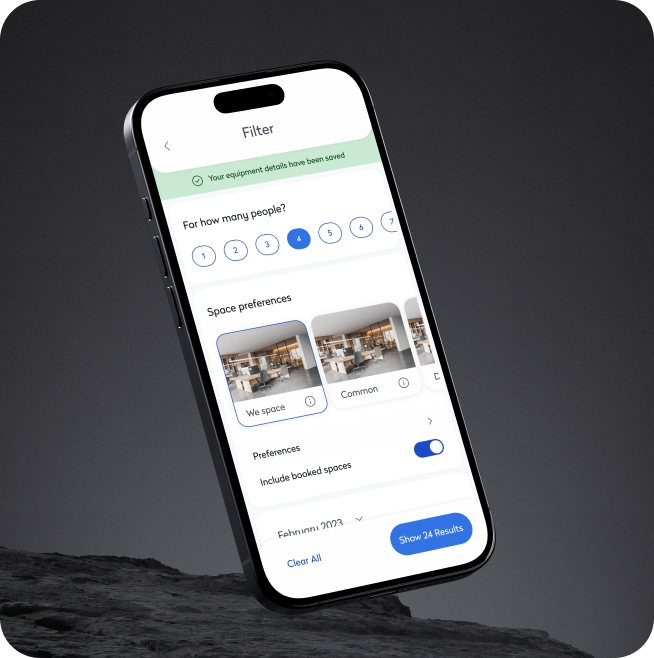 To help users quickly find the right space for their needs, we implemented advanced filtering options across all booking interfaces. Users could filter desks and rooms by capacity, amenities, location, and availability, tailoring their workspace selection to fit their specific requirements. Whether booking a quiet spot for focused work or a tech-enabled room for a client meeting, employees could now search with confidence and precision. This level of customization not only elevated the booking experience but also ensured that every workspace felt right for the task at hand.